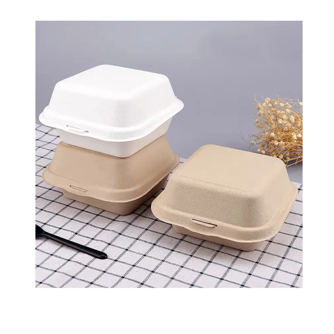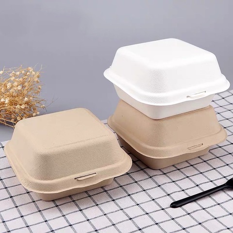 Caja de hamburguesas de pulpa de bambú biodegradable personalizada, embalaje para llevar blanco Natural, exhibición CMYK/Pantone, papel de bagazo de alimentos